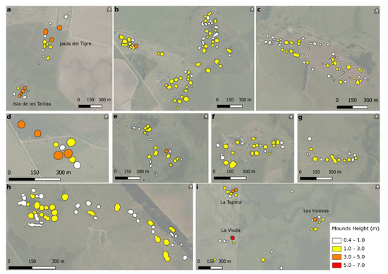 Maps with the spatial configuration discriminated by mound heights in different sites of the study area. (a) Isla de los Talitas and Jaula del Tigre (India Muerta wetlands cluster), (b) Mal Abrigo (Sierra de los Ajos cluster), (c) Colina Damonte (Sierra de los Ajos cluster), (d) García Ricci (India Muerta wetlands cluster), (e) Cabrera B (Campo Alto cluster), (f) Cerro Alto C (Campo Alto cluster), (g) El Solitario (Campo Alto cluster), (h) Los Ajos (Sierra de Los Ajos cluster), (i) La Tapera, Los Huesos and La Viuda (India Muerta wetlands cluster).
