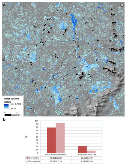 The result of the flood-risk analysis made it possible to verify that the India Muerta region has many areas which are potentially floodable with maximum levels of water accumulation of 2.7 m. More than 21% of the areas of the terrain are made up of depressed zones with a point of runoff situated at a lower level. However, only 7% of the cerritos are located in these areas (Figure 9). The emplacement of the mounds in areas of an insular nature extends beyond their figurative sense. The paleo-environmental studies confirm that much of the terrain was made up of wetlands and flood plains and the existence of water management structures associated with these types of constructions is recognized in the research. The calculation of flood risk takes into account the riverbeds and presents the plains of the study area with wide flooded areas (Figure 9). Attention is not paid to the canalization of large-scale cultivation which would imply a variation of the water pulses and drainage, particularly within these systems of wetlands with imperfect drainage, in which the presence of bodies of water is a constant over time.