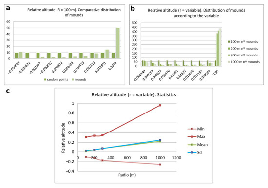 Visibility analyses have been widely used in archaeology, particularly since the development of GIS in the field of landscape archaeology [77] (pp. 1–28). In this case, the visibility analysis (visual perception of the terrain) seeks to characterize the visual prominence of the whole area, comparing locations with mounds and those without. Prominence is defined as the size of the area from which each location is visible from others. That is to say, one position will be more prominent if it is visible from a greater area. Therefore, our analysis is based on visibility calculations more than on visibility [78] (pp. 265–292). These representations have been defined by Loots [79] in GIS software as reflective viewshed. The calculations were implemented with the viewshed tool, adding up the altitude in each pixel and the height of a person (1.7 m) from which each calculation was carried out and limited with different distances in relation to the possibilities of perception potentially permitted by each one [80]. The calculations were made for all of the terrain cells and their representation can be taken to be a total viewshed [81,82,83] defined as an index with values between 0 (pixels not visible from any other pixel) and 1 (pixels seen from all of the pixels). For both the visibility and relative altitude analyses different scripts were programmed in Arc GIS 10.4., which automates the calculations and were executed over many hours of computation in order to obtain the values from the thousands of pixels of which the DTM of the study area consists.