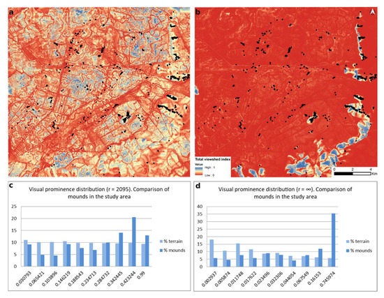 The total viewshed index indicates, for each point of the terrain, the number of points from which it is possible to see the first. The index acquires a value of 1 when it is possible to see a point from all of the points of the terrain, and a value of 0 when it can be seen from none of them. (a) From the environment of 2095 m. (b) From any point of the study area. (c) Graph of visual prominence distribution (r = ∞). (d) Graph of visual prominence distribution (r = 2095).