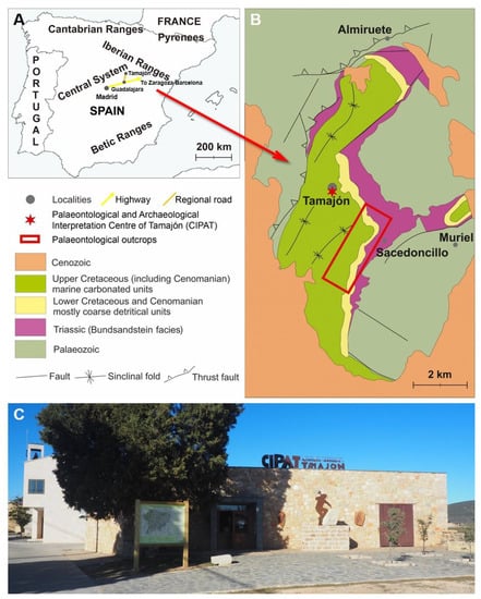 (A) Geographical location of Tamajón (Guadalajara, Spain) in the context of the Iberian Peninsula, with some of the main roads of access to the town; (B) Geological context of Tamajón, showing the main stratigraphic intervals and tectonic structures, and location of the “Paleontological and Archaeological Interpretation Centre of Tamajón” (CIPAT) and the main paleontological outcrops; (C) Image of the current appearance of the exterior of the CIPAT.