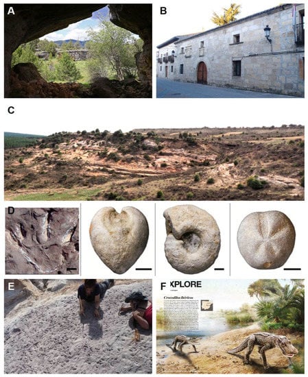 (A) Photographic view from the inside of a karstic hollow of the “Ciudad Encantada” of Tamajón (Guadalajara, Spain), where important paleontological and archaeological discoveries have been made; (B) View of the “Palacio Mendocino”, a palace in Renaissance style and with a 16th century Plateresque facade, with a vaulted semicircular arch entrance and noble coats of arms carved in Tamajón Stone, which is currently used as the town hall; (C) Panoramic view of the Upper Cretaceous of Tamajón, where paleontological outcrops include several levels rich in fossil plants, numerous invertebrates and some vertebrates; (D) Fossils from the Upper Cretaceous site of Tamajón. Ichnite (fossil footprint) corresponding to a foot of the main crocodylomorph track (left). Lateral view of a mold of a bivalve Granocardium (Granocardium) productum (centre, left). Lateral view of an ammonoid Spathites (Jeanrogericeras) saenzi (centre, right). Apical view of an echinoid Hemiaster bufo (right). Graphic scales: ichnite: 2 cm, bivalve and ammonoid: 1 cm, echinoid: 0.5 cm; (E) Image of the track surface discovered by Professor Manuel Segura of the University of Alcalá, with traces of crocodylomorphs, a theropod dinosaur and fishes, during the process of preparation and study during July 2018; (F) Image of the report “Crocodilos Ibéricos” about the Cretaceous fossil footprints of Tamajón, published in May 2016 in the Portuguese edition of the National Geographic Journal.