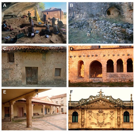 (A) Archaeological excavation campaign in the “Abrigo de la Malia” site of Tamajón (Guadalajara, Spain); (B) Image of one of the karstic caves of the “Ciudad Encantada” of Tamajón, inhabited since the Upper Palaeolithic, with a stone fence placed in front of its access; (C) View of a house in Tamajón, which has retained traditional spatial divisions and construction methods; (D) Image of the portico of the “Iglesia de Nuestra Señora de la Asunción”, a church in Romanesque style, showing the characteristic appearance of Tamajón Stone; (E) View of the portico of the main square “Plaza Mayor” of Tamajón with columns that show the suitability of the Tamajón Stone for obtaining uniform blocks; (F) Detail of the main facade of the “Colegio de San Ildefonso” college (Alcalá de Henares, Spain), current seat of the Rectorate of the University of Alcalá and an example of the use of Tamajón Stone outside the locality.