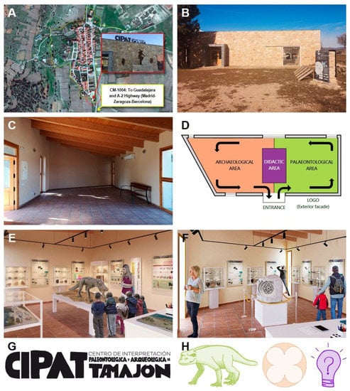 (A) Location of the former tourist information building of the cultural centre of Tamajón (Guadalajara, Spain), currently housing the Paleontological and Archaeological Interpretation Centre of the locality (CIPAT), next to the access by the CM-1004 road to Guadalajara and the A-2 Highway (Madrid-Zaragoza-Barcelona; (B) Image of the original appearance (before development of this project) of the access area to the main facade of the former tourist information building of Tamajón; (C) Image of the original appearance of the interior of the former tourist information building of Tamajón; (D) Division of spaces proposed for the CIPAT, differentiating the Paleontological, Archaeological and Didactic areas and showing the itinerary designed for the visit; (E,F) Three-dimensional (3D) virtual models of a visit to the Paleontological (E) and Archaeological (F) areas of the CIPAT, showing the main central pieces, display cases with original samples and other materials, explanatory panels and dioramas; (G) Logo of the CIPAT, black and white version; (H) Motifs referring to the Paleontological (left), Archaeological (centre) and Didactic (right) areas of the CIPAT.