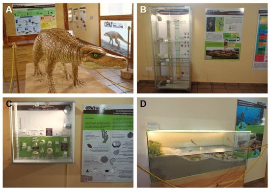 (A) Detailed image of the reconstruction of a crocodylomorph, producer of the ichnites found in the Upper Cretaceous of Tamajón (Guadalajara, Spain), on themed surface, as central outstanding piece of the Paleontological Area of the Paleontological and Archaeological Interpretation Centre of the locality (CIPAT); (B) Photograph of the display case of the same area with the recreation of the Cenomanian-Turonian lithological section of Tamajón, which includes the Utrillas, Villa de Vés and Picofrentes formations, and the lower part of the Ciudad Encantada Formation, showing on its right the panel “La Geología de Tamajón-The Geology of Tamajón”; (C) Image of the display case of the same area with representative fossils of Tamajón and, on the right, the panel “El afloramiento marino: Cuando Guadalajara era un mar-The marine outcrop: When Guadalajara was a sea”; (D) Photograph of the diorama of the CIPAT Paleontological Area, representing different Upper Cretaceous transitional and marine ecosystems of Tamajón, showing on its right the panel “Interpretación paleoambiental: ¿Cómo era Tamajón en el Cretácico-Paleoenvironmental interpretation: How was Tamajón during the Cretaceous?”.