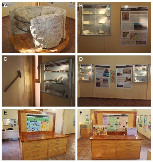 Simultaneously, the CIPAT supports both educational and tourist visits, being included as a visiting point of different routes and itineraries, helping to raise awareness of the need to study and preserve the rich heritage of Tamajón and its importance as a valuable resource for the promotion of local development through cultural tourism (Figure 9F), especially geotourism [], understood according to the Arouca Declaration [] as that “which sustains and enhances the identity of a territory, taking into consideration its geology, environment, culture, aesthetics, heritage and the well-being of its residents”.