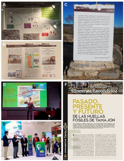 (A) Detailed view of the background designed for the interior of the display case for the continental outcrop (track site) of the Paleontological Area of the Paleontological and Archaeological Interpretation Centre of Tamajón (CIPAT); (B) The triptych with information about the CIPAT, which is being distributed free of charge to all visitors; (C) Photograph of the panel at the exterior of the interpretation centre, which presents the CIPAT and invites the visitor to enter and get to know it; (D,E) Outreach of different aspects of the CIPAT at the paleontological weekend organised by the Tamajón town council in September 2018 (D), and at the Guadalajara Day organised by the International Tourism Fair (FITUR) in January 2019 (E); (F) Outreach publication on the content and the scientific and didactic potential of the Cretaceous track surface [].