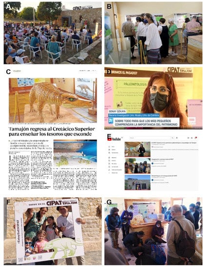 (A,B) Inauguration of the Paleontological and Archaeological Interpretation Centre of Tamajón (CIPAT) (20 August 2021); (C–E) Different media covering the inauguration and first days of the CIPAT: ABC Newspaper (C); Castilla-La Mancha Television (D); and Youtube Website (E); (F,G) A family visit, in the outer facade (F); and the development of an educational activity, in the Didactic Area of the CIPAT (G).