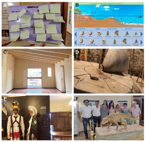 Since the fossils (original samples and replicas) and the archaeological remains allow the development of different didactic activities aimed mainly at children at different educational stages [,] but also to adults, a specific space was created for this purpose: the Didactic Area. Therefore, a large “sabina” wooden table was designed and manufactured, being divided into two halves by a high vertical board and containing drawers for storing learning material when not in use. In the Didactic Area, not only the main scientific results obtained in Tamajón are being shown in a simple and engaging way, but also how paleontologists and archaeologists work, and the scientific method that allows them to infer what the past was like. Among the didactic activities prepared specifically for the CIPAT, we can highlight those that show how to deduce paleontological information from ichnites [] or how to recreate the appearance and way of life of the flora and fauna that later became the fossils found in Tamajón. Special attention has been paid to the Didactic Area to provide the means (specific panels, surveys) to collect feedback, expecting to improve and adapt expositive materials and the educational activities of the CIPAT (Figure 6E,F).