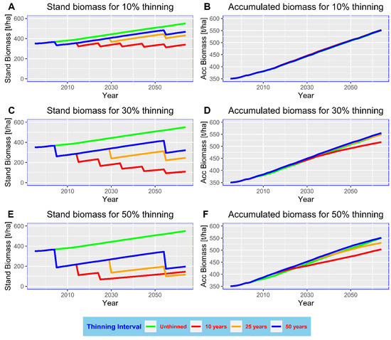 Stand biomass (A,C,E) and accumulated biomass (B,D,F) at 10%, 30% and 50% thinning respectively in different thinning intervals.