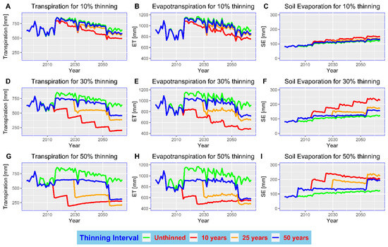 Transpiration (A,D,G), ET (B,E,H) and soil evaporation (C,F,I) for 10%, 30%, and 50% thinning respectively in different thinning intervals.