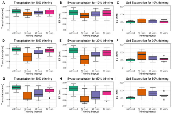 Boxplot for transpiration (A,D,G), ET (B,E,H) and soil evaporation (C,F,I) for 10%, 30%, and 50% thinning, respectively, in different thinning intervals.