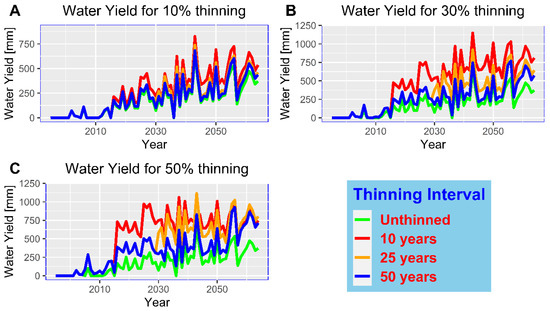 Water Yield for (A): 10%, (B): 30%, and (C): 50% thinning in different thinning intervals.