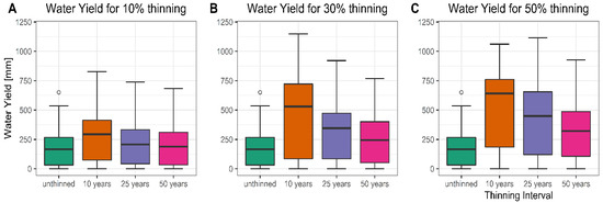 Boxplot for water yield for (A) 10%, (B) 30%, and (C) 50% thinning, respectively.