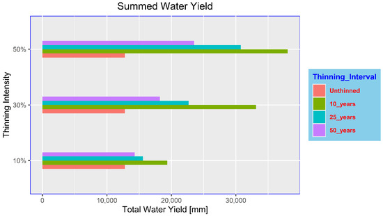 The graph (Figure 6) shows the total water yield over the period of 70 years (stand age from 75 years to 145 years). Water yield is maximum for 50% thinning at the 10 year interval. The water accumulation is increasing with the thinning intensity but is decreasing with the increasing thinning interval. Light, moderate, and heavy thinning produced 51.34%, 158.98%, and 197.27% more water than in an un-thinned stand for 10 years interval. However, the increment in water yield in comparison to un-thinned stand remained to 11.84%, 42.36%, and 83.82% for light, moderate, and heavy thinning, respectively, in stand thinned at the 50 year interval.