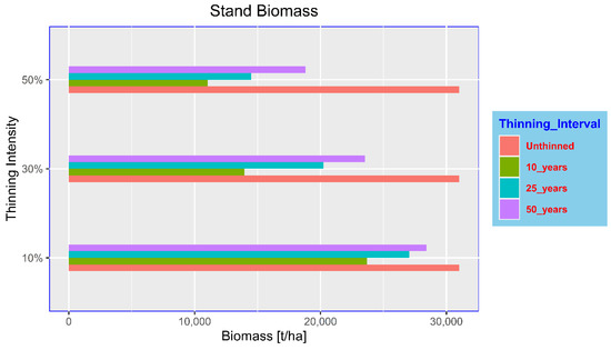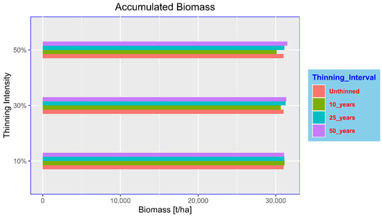 Regarding the forest growth in terms of biomass, the model predicted less stand biomass for all thinning intensities and intervals than in an un-thinned stand. The finding is also similar to the research studying the effect of thinning over 50 years in moist forest of the Northern Rocky Mountains by Shen et al., 2019 [51]. The stand biomass for all thinning regimes were significantly different than in un-thinned stand. However, the significant differences were not seen among the thinning regimes for the accumulated biomass. This result is aligned with Eriksson, 2006 [52] where it is mentioned that detection of significant differences in accumulated biomass from different thinning regime is difficult in Norway spruce stands. The highest biomass is produced in 50 years interval for all thinning intensities. This might be because a short thinning interval between successive thinning did not allow the remaining trees to spread their foliage to an area made available by thinning [53]. In contrast, thinning with a longer interval in between successive thinning provides more area and scope for production. With these results, we can interpret that for any thinning intensity, the thinning interval should be increased to produce more biomass.