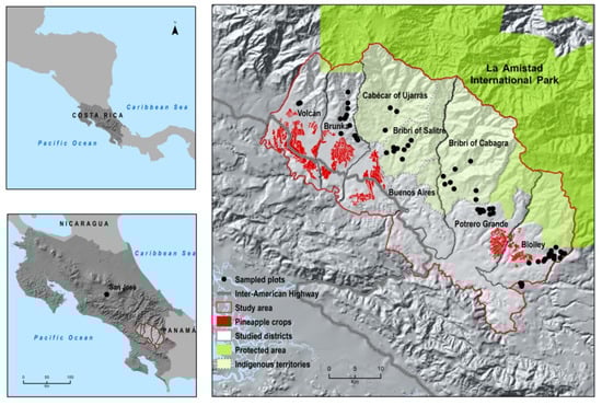 Location of the study area, the plots sampled and the distribution of the pineapple crops. Source: generated by the authors based on the cartographic distribution of pineapple crops [] and the Costa Rica Atlas [].