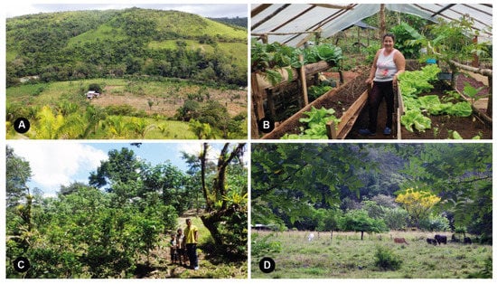Peasant and indigenous family farms. (A) View of a peasant farm; (B) Detail of a peasant family’s vegetable garden; (C) Coffee growing in silviculture and polyculture in the indigenous territory of Cabagra; (D) Silvopastoral system with a predominance of shrub species in a peasant farm. Source: authors’ own images.