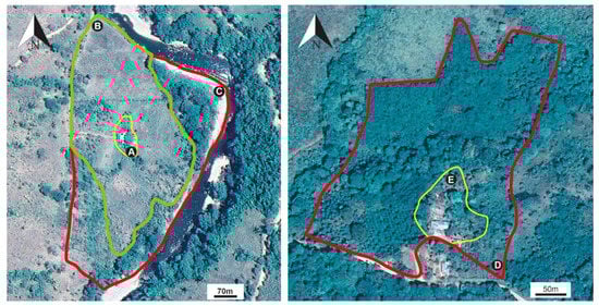 Examples of the layouts of FF plots in the municipality of Buenos Aires. On the left, peasant management; (A) First perimeter with the house and orchard; (B) Second perimeter with the coffee and basic grain crops under different management systems; (C) Third perimeter with conserved forest. On the right, the indigenous polyculture management; (D) First perimeter with the house and orchard; (E) Second perimeter with the crops integrated within the forest. Source: generated by the authors from Google Earth/Image © 2021 CNES/Airbus images.