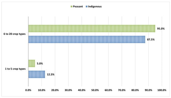Product diversification refers to the variation in the perennial and seasonal crops produced at the farms, and there were no significant differences between the peasant and indigenous plots. The vast majority (95%) of the peasant farms produced between 6 and 20 agricultural products simultaneously, while this proportion was somewhat lower in the indigenous farms (87.5%: Figure 5). This product diversity is the result of growing different crops simultaneously at the farm (vegetables, legumes, tubers, fruit trees and coffee), as favoured by the nonseasonal climate in this tropical zone. Some of the crops on these farms (basic grains: corn, beans and rice) are produced through intercropping, following two to three annual harvest cycles.
