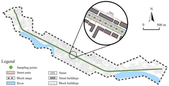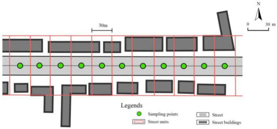 In the process of indicator calculation, we use ArcGIS 10.6 software to grab the sampling points along the road centerline in the urban road network. There is no fixed requirement for the spacing of sampling points, which can be determined according to the scope and accuracy requirements of the research. Considering the research methods of some scholars, the spacing of sampling points is usually between 20 m and 100 m [7,77,78]. In this paper, the interval of sampling points is set as 30 m; 30-m ranges composed of 15 m before and after each sampling point were taken as the length, and the range comprising the first row of houses along the street and the street space itself was taken as the width, so as to form street units with the sampling point as its geometric center. Then, we measured all the indicators in the indicator system within each street unit, and recorded the indicator values in the attribute table for that sampling point (Figure 2).