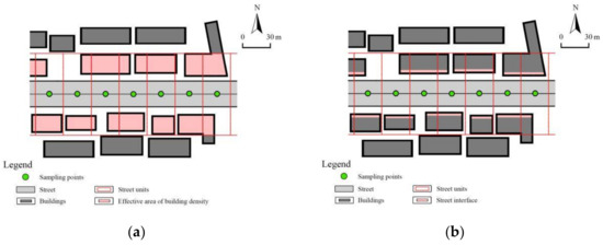 Indicators under the Suitability dimension include BD, SAR, SID and EP, which need to be measured on the basis of urban spatial data and building data. The effective area for calculating the BD is the building area located within the street unit (Figure 3a). The calculation of the SID takes the length of the street interface in the street unit as the effective length (Figure 3b). The calculation of SAR, which is the ratio of street width to interface height of the street buildings, SAR = D/H, requires building height data and street width data [38].