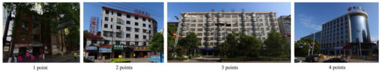 For the BFQ, we used the judgment method again to formulate its rating standard. The above participants were invited to formulate the rating standards for the quality of building facade, mainly with respect to materials, industrial precision or process, maintenance, and use requirements [31]. In addition, the grading of quality corresponds to the BFQ of a single building (Table 5, Figure 4).