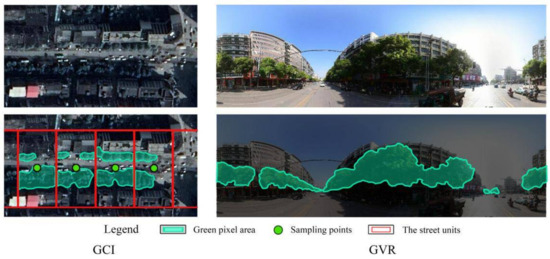 ABH is the average height of all buildings in a street unit. The GCI and GVR were calculated on the basis of remote sensing images and street view images, respectively. We used GIMP 2 and AutoCAD 2010 software to process the images, calculate the green pixel area in the image, and then calculate the GCI and GVR of each street unit (Figure 5).