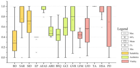 Indicators under the Vitality dimension include LFM, LFD, TA, HSA and PD, which are calculated using POI data and the data for per capita residential building area. The LFM and LFD are calculated directly by means of a formula, depending on the type and quantity of the POI in the street unit. The calculation of TA and HSA is based on the Origin–Destination Cost Matrix Network Analysis Tool of ArcGIS 10.6, which is used to obtain the walking distance from the sampling point to the nearest traffic facilities and activity hot spots, and then further calculates the walking time based on the average walking speed of pedestrians of 1 m/s. The population is calculated by the ratio of the residential building area in the unit to the per capita residential building area of the city. In addition, the PD is calculated by dividing the population by the area of the street unit.