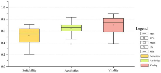 According to the above theories, it can be seen that Suitability, Aesthetics and Vitality are the main style performance indicators of the urban environment. They can be used to reflect the characteristics of the city in terms of form and activity, and represent the comprehensive performance of the static and dynamic style of the city. Psychological impression comes from the Suitability and Aesthetics of the urban form, and so it can be attributed to these two aspects. The impact of urban environmental performance mainly lies in people’s comfort in the environment, which can be considered an aspect of urban Suitability. Based on the above considerations, we summarize the performance of urban style into three main dimensions: Suitability, Aesthetics, and Vitality.