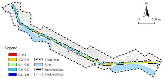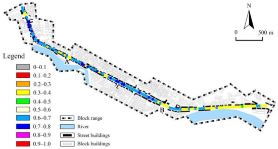 Suitability is used to measure the comfort of the spatial environment resulting from the characteristics of the urban spatial form. We classify Suitability into two aspects: urban form and urban environment. The former is expressed by BD [57], SAR [73], and SID [31,74], and the latter is expressed by environmental performance (EP). BD is a common indicator for evaluating the built environment of a city, and can reflect the space compactness and open space rate of a block. SAR is an important index for expressing street size and spatial openness. An appropriate SAR is conducive to pedestrians’ perception of street space. The SID can reflect the degree of enclosure of the street interface and affect the shape and comfort of street space. EP is proposed to describe the quality or comfort level produced by the built environment, and is assigned a score from 0 to 10 based on the LST and LCZ classifications.