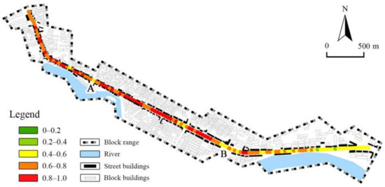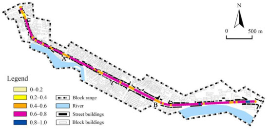 There are few research conclusions on evaluation of LFD. We tried to obtain its threshold by reasoning. Assuming that the measured LFD result of a 20-m-long street unit is 1, this would meean that there are 20 shops (POI points) in the unit. Taking the width of each shop as 4 m, two floors on both sides of the street unit would be required to accommodate all of them. Combined with life experience, the block space in such a case will usually have high vitality and popularity. On the basis of the above reasoning, we set the performance value as 1 when the LFD value exceeds 1.