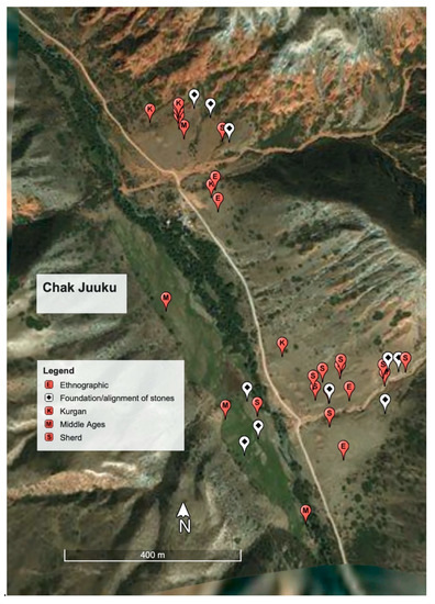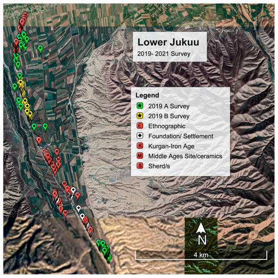 During the 2019 and 2021 surveys, we registered about 350 loci (single artifact finds, sherd scatters, graves, burial mounds (kurgans), house foundations, and house depressions in the Lower Juuku and Upper Juuku). These loci were also placed in chronological sequences based on local typologies for burial monuments, settlements, and artifacts (ceramics). Our initial observations suggest that the large Medieval settlements (fortresses, citadels, caravanserais, and proto-urban towns) found in Juuku and the neighboring valleys of Sutti Bulak, Chichi Khan cover over and obscure earlier Bronze and Iron Age settlements. When both Medieval and Iron Age ceramic sherds are found on the same land surfaces and loci this indicates that later Medieval deposits cover over and obscure earlier Iron Age settlement features. The prominent appearance of above-ground mortuary features Iron Age burial mounds (kurgans), often 5 to 50 m in diameter and 0.1 to 3 m or more in height [20,21]. These burial mounds are often located near Medieval walls, farmsteads, and dwellings, therefore, marking clear boundaries between Medieval settlements and Iron Age mortuary complexes. Logically, this also means that the places where Iron Age burial mounds exist today are landscapes that were not used by later Medieval populations for house or settlement construction. These landscape palimpsests are essential to developing a deeper and more nuanced approach to site and non-site archaeology in regional contexts [34,35,36].