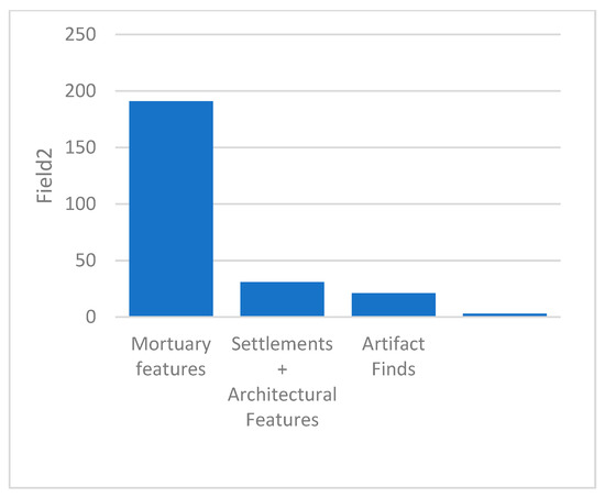 Histogram of site types in Lower Juuku: mortuary features, settlements and architectural features, and artifact finds. The x-axis represents types of loci, and the y-axis or Field 2 is the number of loci.