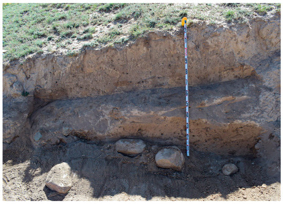 Settlement 2, situated at an upper terrace at an elevation of 2090 m asl: It is a series of double-walled stone alignments of at least four large room blocks and measures about 17.5 m X 12 m. The stratigraphic profile examined is a west-facing cut found at a deep erosional gully that dissects this upper terrace (Figure 8). When this cut was first discovered, a sheep scapula was found at about 1.3 m in depth from the present ground surface. The cultural levels at this profile are complex since the house fill represents at least three or four different occupation levels. The burnt wood (charcoal) sample and two flotation samples were taken approximately between 50 to 80 cm below the present ground surface in the second to third fill or midden sequence. At about 1.7 to 2.0 m below the surface are a series of thin buff-colored plastered floors or laminations that may represent the different layers of an ancient sufa or kang (sleeping bench). We did not take charcoal wood samples for dating or the flotation samples from the sufa or floor levels because there was no visible carbonized ash, soil, or charcoal at those levels. The site is dated to the Medieval Qarakhanid period and has an approximate radiometric dating of 990–1050 cal AD (see Table 4). This is also confirmed by the Medieval redware ceramics and a granite grinding stone found on the surface of this settlement. The archaeobotanical remains showed a paucity of seeds from the 11.5 L of collected sample, only one barley seed (Hordeum vulgare) was identified, the rest were wild seeds [33].