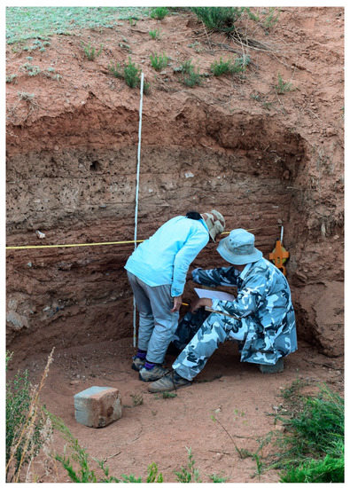 Settlement 1, situated at 2057 m in elevation on an upper terrace above a ravine: It is a Wusun Period site dating from 22–206 cal AD (see Table 4). The settlement is located on both sides of the erosional gully. On the north side there are no indication of house foundations, only shallow depressions of house pits. The south side of the gully consists of the outline of three or four room blocks. Room 1 is about 5 m (north–south) × 3 m (east–west), and its west wall outlines Room 2, which is 5 m (north–south) by 4 m (east–west). The outline of Room 3 is further east, where there are only traces of a south wall (3 m in length) and a trace of a north wall (1 m in length). On the south side of this room block is a thick stone wall two courses wide. These stone walls are constructed of irregular boulders. The erosional cut of the exposed profile is about 2.5 m in depth from the surface and runs in an east–west direction from the reaches of a small sandstone canyon that dissect this terrace. The stratigraphic profile is located on a south-facing erosional cut found on a steep terrace bank at 2044 m asl. The exposed profile is 3 m in length and has a depth from the present ground surface 2 m in depth (Figure 7). There are roughly about six different archaeological layers within the house pit fill. Each layer is around 20 to 30 cm thick of midden deposit consisting of chestnut and red-clay soils intermixed with charcoal and disintegrating mudbrick. There were many animal bones fragments and one cattle vertebrate found at 80 cm below the present ground surface. A redware Iron Age ceramic with white slip discovered at 90 cm below the surface. There were at least three discernible layers of thin plaster floors. At about 1.5 m below present ground surface there were small angular stones and small pebble and sand deposits that appear to be subsoil (non-cultural soil). From an exposed profile of charcoal room fill, three archaeobotanical soil samples (14.5 l) were taken in layers 4 and 5, near where the Iron Age ceramic sherd was found. The small charcoal sample was also taken in the same vicinity.