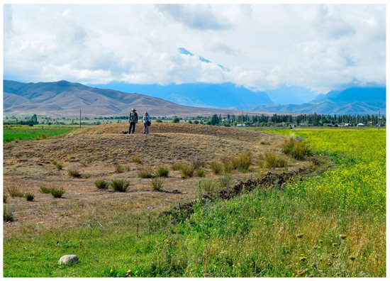 - Motuzaite Matuzeviciute, G.; Tabaldiev, K.; Hermes, T.; Ananyevskaya, E.; Grikpedis, M.; Luneau, E.; Merkyte, I.; Rouse, L.M. High-altitude agro-pastoralism in the Kyrgyz Tien Shan: New excavations of the Chap farmstead (1065–825 cal BC). J. Field Archaeol. 2020, 45, 29–45. [Google Scholar] [CrossRef]