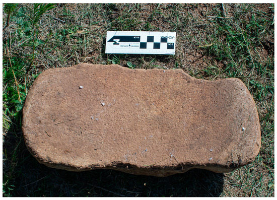 Many artifacts were either found as isolated finds or as parts of scatters. The grinding stones were usually made of granite with a concave surface. Figure 11 is a granite grinding stone found as an isolated surface find. The grinding stone measures 30 cm (length) × 18 cm (width) × 5 cm (thickness).