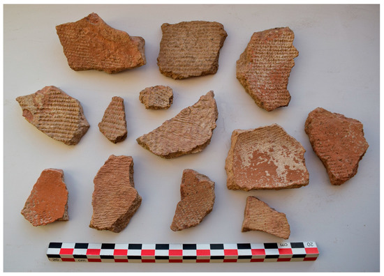 Over 100 ceramic sherds were found from Upper and Lower Juuku surveys. The majority of the ceramics were redware coarse wares with sand or crushed rock temper. During the survey we made rough distinctions between the Iron Age handmade ceramics (coil or slab) and the Medieval wheel-thrown ceramics. In addition, we found handle, rim, and base fragments, spindle whorls, and a very few pieces of glazed Qarakhanid ceramics. More detailed analyses of these ceramics will be conducted by a ceramics specialist in the future. Figure 12 shows the interior of redware ceramic sherds, some with fabric impressions and red slip. These ceramic pieces date to the Iron Age and represent hand-made or slow wheel ceramics. A detailed description of fabric-impressed ceramics and actual fabric fragments from Bronze and Iron Age contexts at the site of Begash in the Dzhungari Alatau Mountains of southeastern Kazakhstan was conducted by Paula Doumani Dupuy and her colleagues [46]. Similar redware sherds, sometimes with light slip, have been found at Iron Age sites in the Talgar region of southeastern Kazakhstan [14,47].