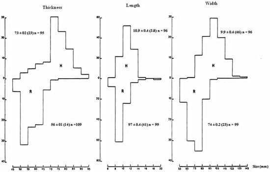 Frequency histograms of Iberian hare (above, H) and European rabbit (below, R) pellet dimensions from samples collected in rabbit warrens (January 1984 and hare bedding sites (October 1983). The mean ± SE, 95%, confidence intervals, and sample sizes are indicated.