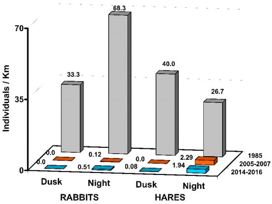 We conclude that, after the population decline of both species, their ecological overlap has increased substantially. Their convergence in nocturnal behavior is most likely a response to the increase in predation pressure [73,74]. Most recent numbers (2005–2016) of roadside counted rabbits are two orders of magnitude lower than in 1985, and hare numbers are only slightly higher (Appendix A, Table A1 and Table A2). The remaining individuals of both species have selected the night as the circadian period that presents the minimum risk of predation. Bakker et al. [75] have shown that European rabbits are sensitive to perceived predation risk [76]. Most of the terrestrial predators of rabbits and hares in DNP have activity peaks at sunset and dawn [4,68,77].