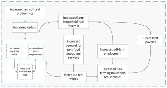 There is ample evidence (e.g., Adegbite and Machethe [1]; Faridi et al. [2]) that agriculture may contribute to poverty reduction in ways other than directly affecting farmers’ wages. Agricultural development may spur economic expansion in nonagricultural sectors, leading to further jobs and economic growth [3]. Increasing agricultural production increases farm income, increases food supply, reduces costs of food, and enhances rural and urban job opportunities [4,5]. Consumers’ demand for goods and services generated in industries other than agriculture may increase as incomes rise. Such connections between agricultural and economic growth have allowed developing nations (such as Burkina Faso, Nigeria, Egypt, Zimbabwe, and Mali) to expand into other sectors with higher growth and earnings [5].