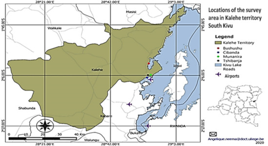 The province of South Kivu is also affected by climate change, which is reflected in the often sudden and late return of rains, high temperatures, and unusual periods of drought [35,58]. In addition to the city of Bukavu, its capital, South Kivu is divided into eight territories, namely: Fizi, Idjwi, Kabare, Kalehe, Mwenga, Shabunda, Uvira, and Walungu. The territories of Kalehe were the focus of this study (Figure 2), and have been the subject of several primary data collections.