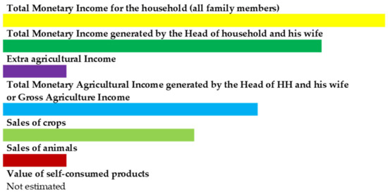 As recommended by Matthews and Coulter [63], the income account began with the revenue that the farmer (the head of household and his wife) received for selling their crops and livestock during the last year. It corresponded to the gross output of agriculture limited to monetary income. In addition, the household could receive other monetary incomes generated by extra-agricultural activities undertaken by the head of household or his wife (named in the figure as “Extra agricultural Income”) or by other family members. When a farmer or other family members work off-farm, they generate additional income for the family that is referred to as plural activity.