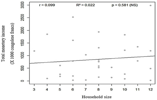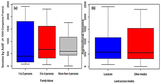 Income was estimated at an exchange rate of 1700 Congolese francs (FC) per USD. To estimate the global income and the agricultural income, this study used the following process. During the interview with the farmers, a question about the family’s total annual monetary income from all the activities was asked. This question was asked once the respondent presented the characteristics of their household and living conditions. The estimation of total income was examined in the context of various questions related to cash inflows and outflows of the households. Then, after having questioned the head of the farm about the use of this income, its components were successively evaluated for agricultural income by distinguishing between crop and livestock production. For crop production, data were collected separately according to the farming practice (pure or associated crop), and they included the cultivated area, the quantities produced, the share of production sold, and the selling price. For animal production, we limited ourselves to a quick survey of the species held and the income made from sales. On the basis of the figures provided, it was possible to reconsolidate the information and obtain an estimate of agricultural income. It should also be noted that at the end of the interview, the income question was asked again to ensure the stability and cross-examination of the information.