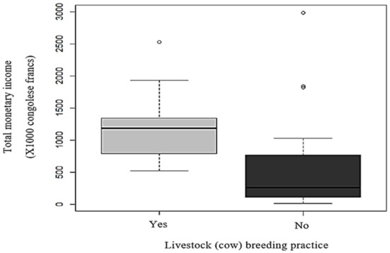 Cattle ownership was also an important element to be considered in the analysis of farm income, as shown in Figure 6. The results showed the importance of organic manure (cow manure) in managing soil fertility and obtaining marketable surpluses. The comparison of incomes between farmers who raised livestock (cows) and those who did not showed that there was a significant difference between them (t-value = 2.526; df = 30.451; p-value = 0.016). Those farmers who raised livestock had more income (1211.462 ± 569.726 X1000 FC) than those who did not (617.955 ± 777.341 X1000 FC).