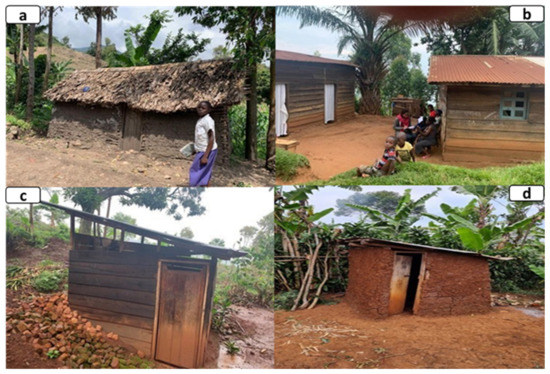 The living conditions according to the types of houses and toilets. (a) Plank house with a roof made of sheet metal in the Munanira groupment; (b) dwelling house made of mud and a roof made of petiole in the groupment of Cibanda; (c) toilet made of plank and sheet metal in the Bushushu groupment; (d) mud and plank toilet in the groupment of Tshibanja. Source: Authors’ elaboration.