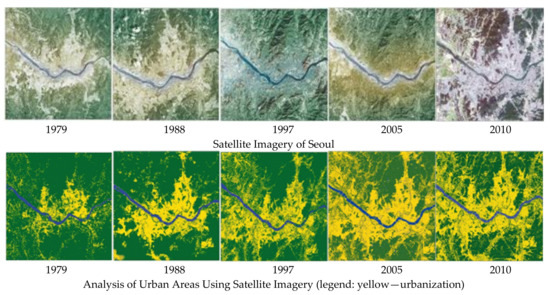South Korea has had rare urban cases, as its cities became global-scale cities in the shortest time periods since 1950. The number has increased from 27 cities and provinces to one Special City, six metropolitan cities, and 100 other cities. Today, 60 percent of the population live in apartments, in a country which previously had no concept of apartments. The housing supply rate has also increased to 113 percent, along with changes in family types [17]. While other countries built cities over several hundred years, South Korea constructed its cities in the seven decades after its liberation. However, this apparent miracle was not what it seemed, since urban dwellers had to face social and economic disparity and intergenerational conflicts due to the rapid and constant change in urban areas. The transformation in the urban areas in Seoul is shown in an analysis of urban areas using satellite imagery in Figure 4.