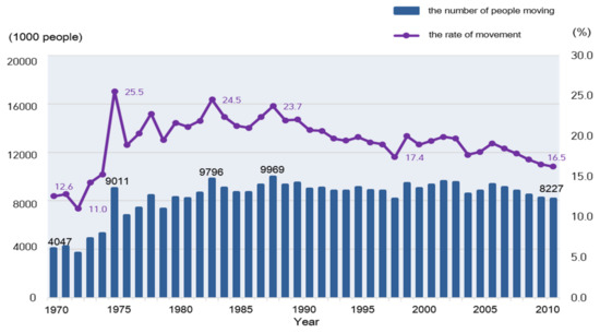 Prior to the 1990s, the Korean society experienced a period of high growth and had established an industrial structure centered on the manufacturing industry. Since the 1990s, as de-industrialization set in and the economy became service-oriented, the phenomenon of economic globalization has also intensified [17,36]. In this period, the first urbanization rate stagnated, and the population movement itself decreased. This means that the population that could locomote; it reached the limit due to the aging of residents in rural areas, and the urbanization—the migration of rural populations to urban areas—was complete. Recent trends of population movement show a trend of a higher proportion of people moving between cities, rather than between urban and rural areas. Population migration in Korea peaked at around 25 percent in the mid-1980s and has been continuously decreasing. The trends in the number of people moving and the rate of movement are shown in Figure 5.
