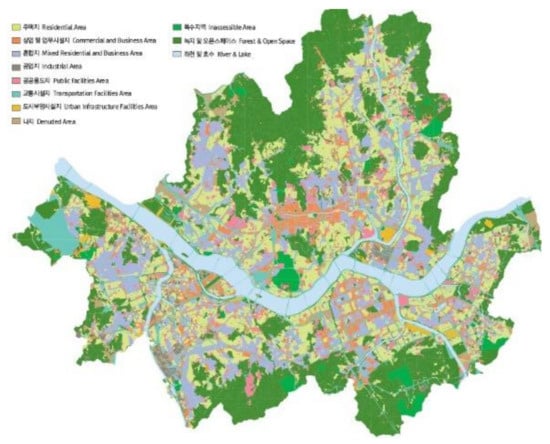 Seoul is South Korea’s center of politics, economy, society, and culture with an area of 605.19 km2. The actual city area is smaller than Tokyo or New York when including the green space of the mountainous terrain surrounding the city. The metropolitan area of Seoul includes Incheon Metropolitan City and Gyeonggi-do, and it covers an area of 70 km2 from downtown Seoul onwards [45]. Seoul’s population was 9,668,000 as of 2020, which was higher than that of New York or Tokyo. In terms of land use, the areas of green open spaces account for 31.9 percent, residential land for 18.9 percent, residential and commercial mixed land for 13.0 percent, transportation facility land for 10.5 percent, rivers and lakes for 8.1 percent, commercial and business land for 5.9 percent, and the public land for 5.1 percent. The status of land use and the current status of parks and green space in Seoul are shown in Figure 6 and Figure 7.